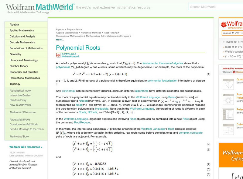 This site from MathWorld discusses the roots of polynomial equations. The site is wonderful in the sense that it gives a few examples to follow the somewhat ambiguous Vieta's theorem. Theorems discussed and applied are the fundamental...