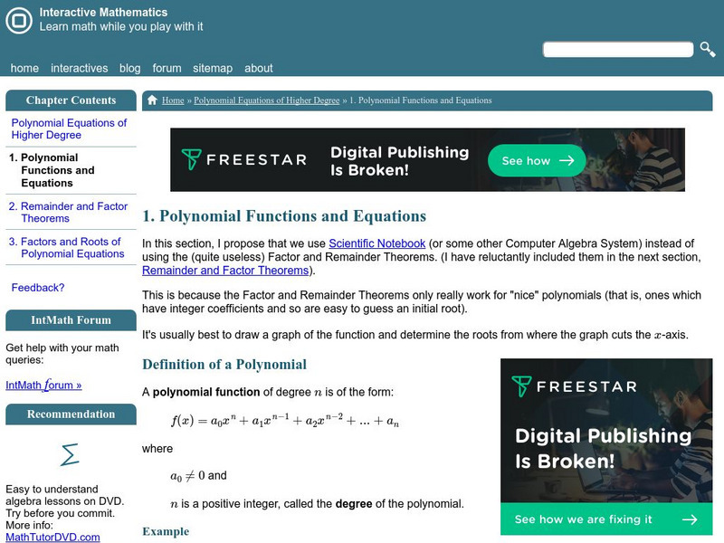 Want to find the roots of a polynomial function? Learn how, using several methods in this tutorial. Graphing and Scientific Notebook are used on the main page. Click on the "Dinosaur Method" link at the bottom of the page to see the...