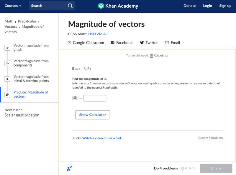 Find the magnitude of a vector. You'll see vectors given in graphs, given in component form, and given by initial and terminal points. Students receive immediate feedback and have the opportunity to try questions repeatedly, watch a...