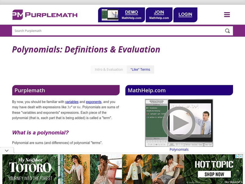A great lesson on polynomials is found at this Purplemath resource. Provides a clear definition of what a polynomial is, tells how to tell what the different degrees of a polynomial are, and how to simplify polynomials by combining like...