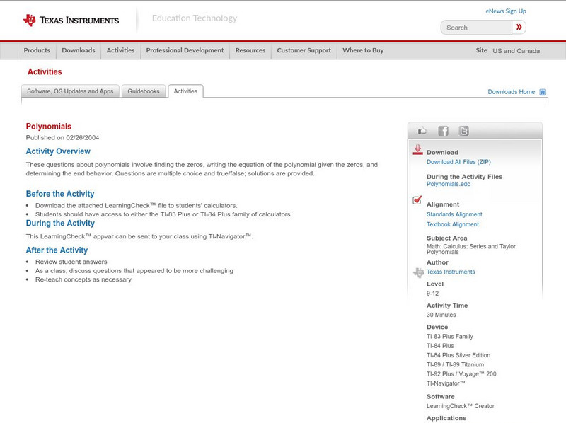 Use this complete and very detailed lesson plan to assess your students' understanding of two important behaviors of polynomials. The first is the relationship between the zeros of a polynomial function and the function's graph, and the...