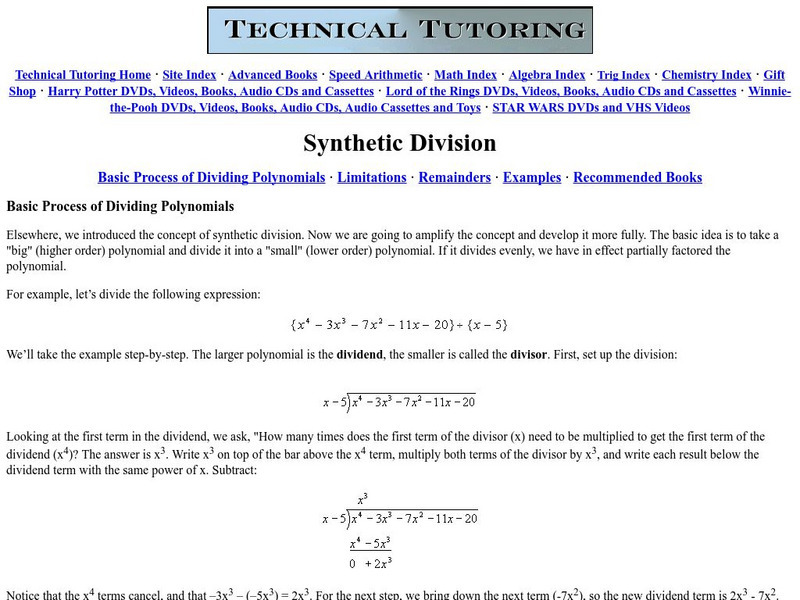 Works through a step-by-step example that gives a good explanation of how to do synthetic division. Also provides other example problems.