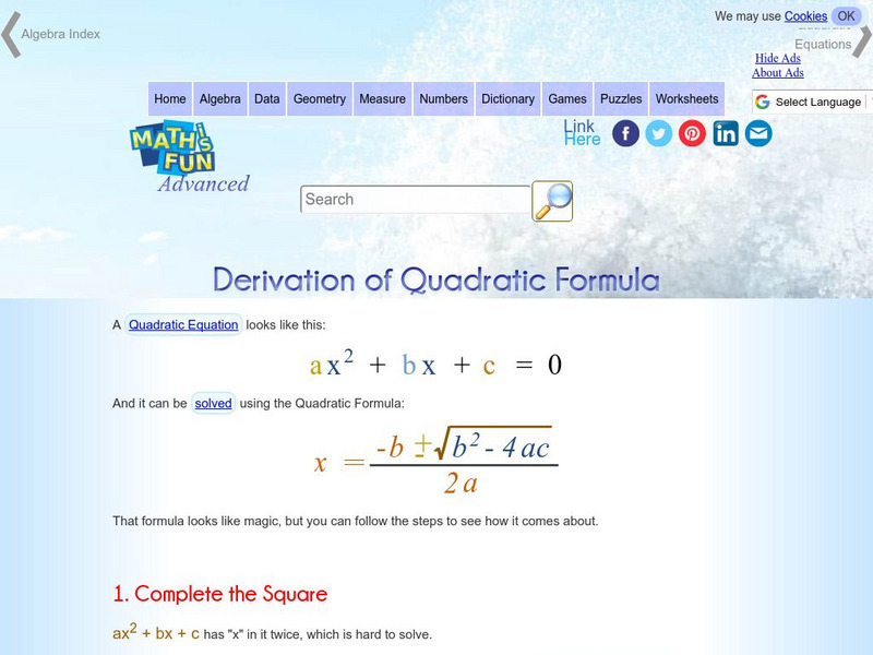 Here is a site that clearly and thoroughly explains how to solve quadratic equations by completing the square. The quadratic formula is derived using this method on this page. Point this site out to students who have been absent or who...
