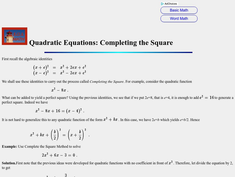 S.o.s. Math: Quadratic Formula: Completing the Square
