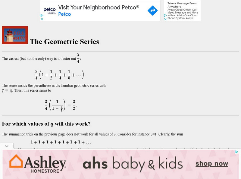 Comprehensive tutorial explaining the geometric series. Includes an example that the student can complete and then check online.