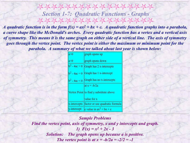Learners explore quadratic functions and their graphs. Vocabulary, examples, methods, and a quiz are included.