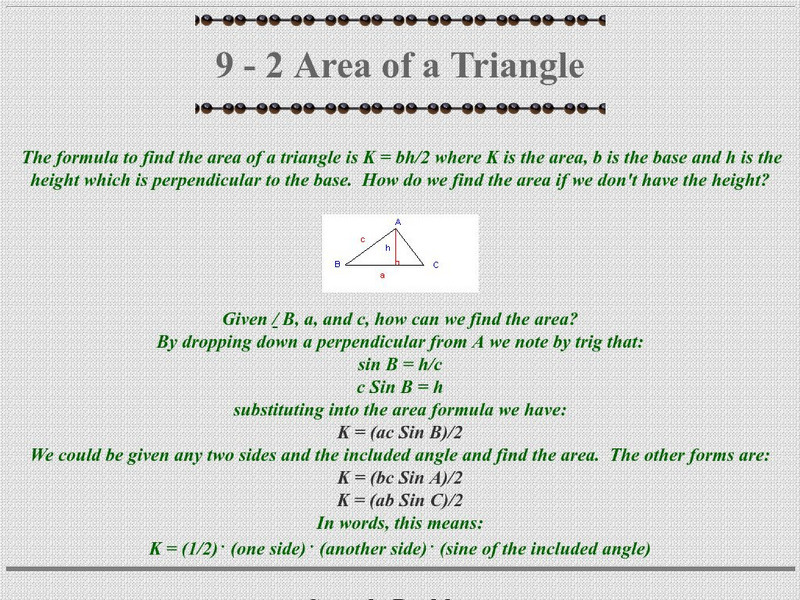 An introduction to finding the area of a triangle using the sine function. Includes several pictures and examples.