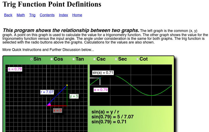 A java applet that relates the unit circle to the graphs of the six trigonometric functions, complete with the values of the functions.