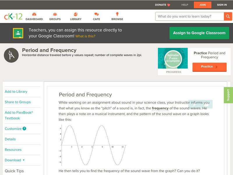 [Free Registration/Login may be required to access all resource tools.] Relating period and frequency for a sine or cosine graph with examples, practice problems, and vocabulary.