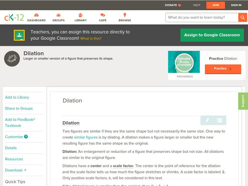 [Free Registration/Login may be required to access all resource tools.] In this lesson, students learn to dilate a figure. Students examine guided notes, review guided practice, watch instructional videos and attempt practice problems.