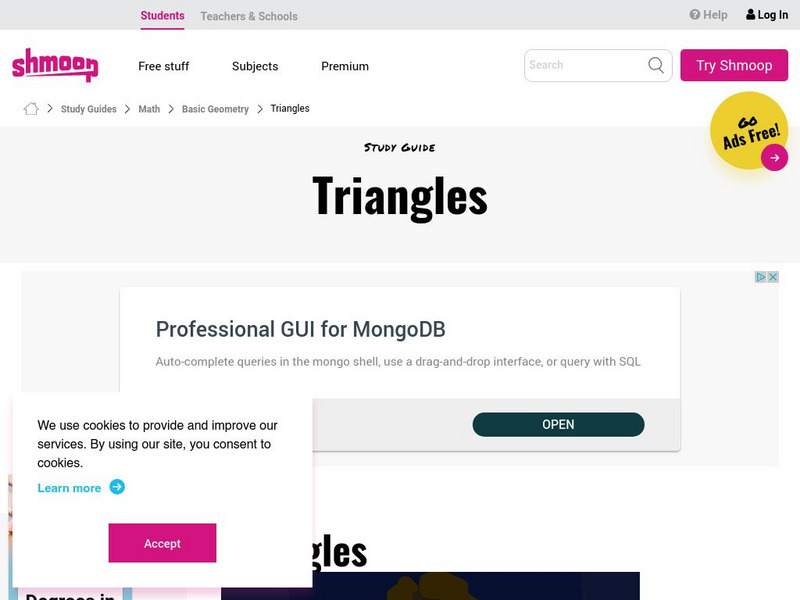 The geometry resource explores triangles. Descriptions, examples, and practice exercises are included.