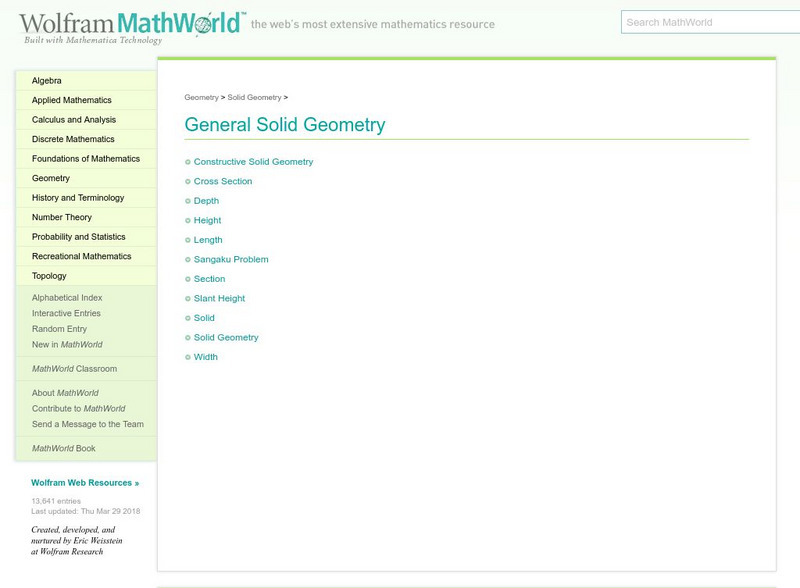 This page has links to general solid geometry topics, including depth, height, width, and length. A good introductory site into geometry.