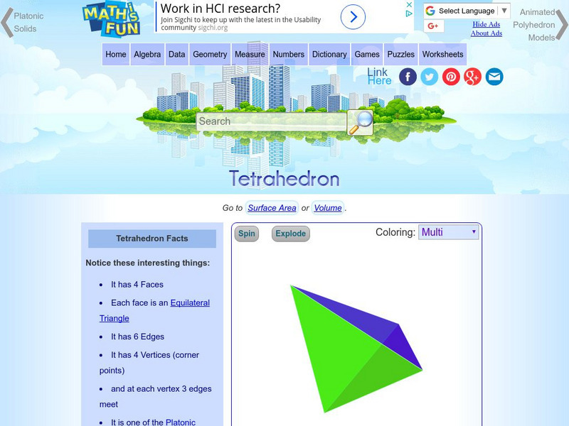 Students learn about the terminology and formulas associated with a tetrahedron. The learning resource consists of definitions, a spinning tetrahedron, and examples.