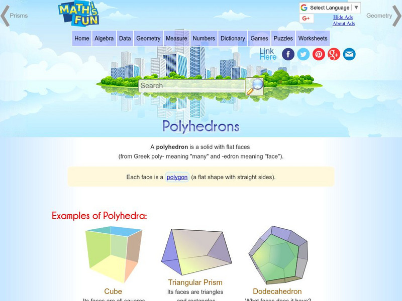 Students learn about the terminology and formulas associated with polyhedrons. The learning resource consists of definitions, images, and examples.