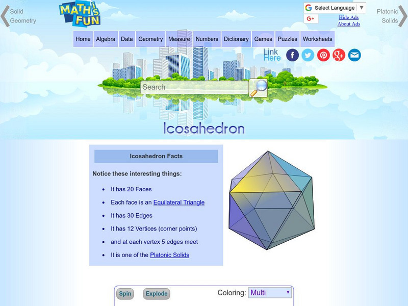 Students learn about the terminology and formulas associated with an icosahedron. The learning resource consists of definitions and an interactive spinning icosahedron.