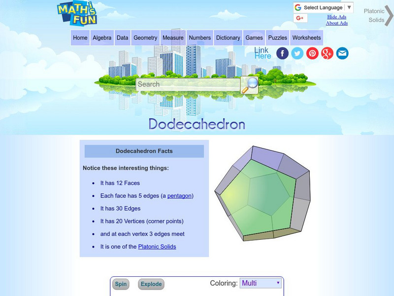 Students learn about the terminology and formulas associated with a dodecahedron. The learning resource consists of definitions and an interactive spinning dodecahedron.