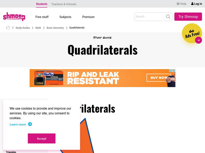 The geometry resource explores quadrilaterals. Descriptions, examples, and practice exercises are included.