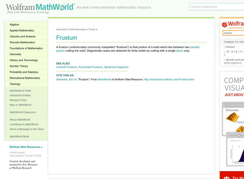 Math World site offers the definition of frustum and links to view a frustum of a pyramid, cone, and sphere.