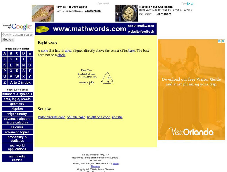 Math Words defines a cone with a picture and formulas for volume given the hieght and base area of the cone.