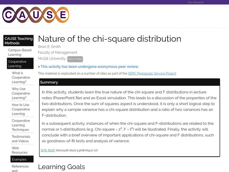 Students learn that statistical distributions, such as the normal, Student's t, chi-square and F distributions are interrelated. They will explore these relationships and discover equivalent statistical tests that can used in specific...
