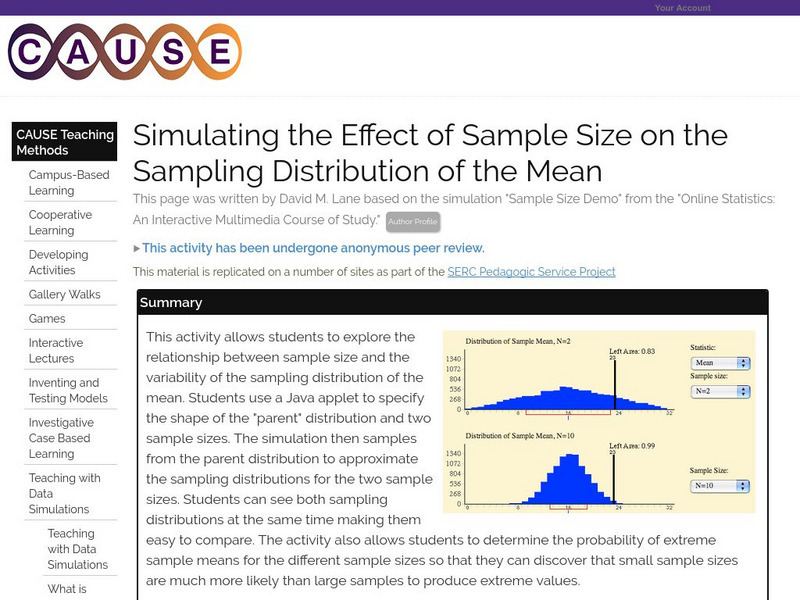 Using a Java simulation tool, learners investigate how sample size is related to the amount of variability one sees in the sampling distribution of the mean. Increasing the sample size decreases the variability. Students are assigned...