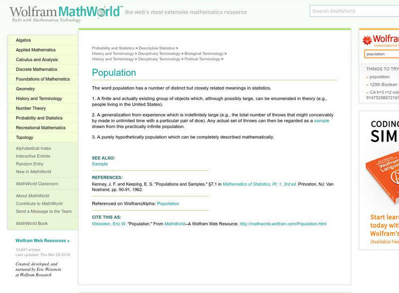 MathWorld offers a number of related meanings for population in the realm of statistics.