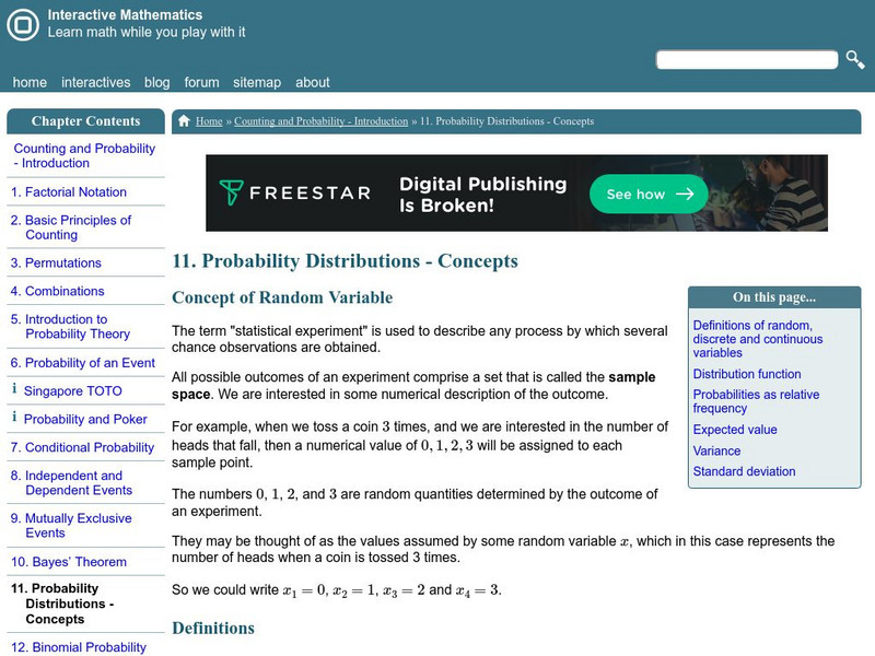 Mini lessons are provided for learning concepts in the world of probability and statistics. Topics include counting and probability, permutations, combinations, independent and dependent events, and distributions. Links to online...