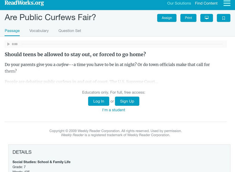 [Free Registration/Login Required] An informational text debating public curfews for teens. A question sheet is available to help students build skills in reading comprehension.