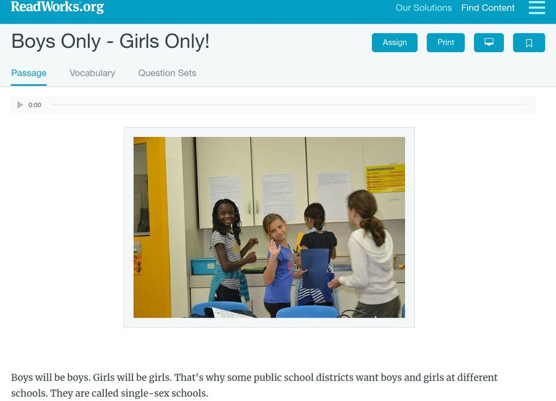 [Free Registration/Login Required] An informational text debating single-sex schools. A question sheet is available to help students build skills in reading comprehension.