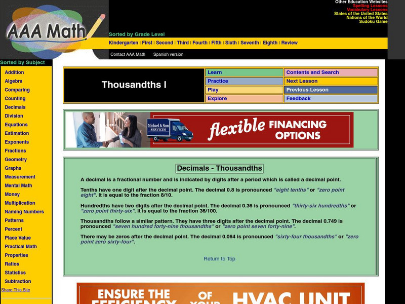 This site explains how to identify the thousandths place value. Includes games to practice this skill.