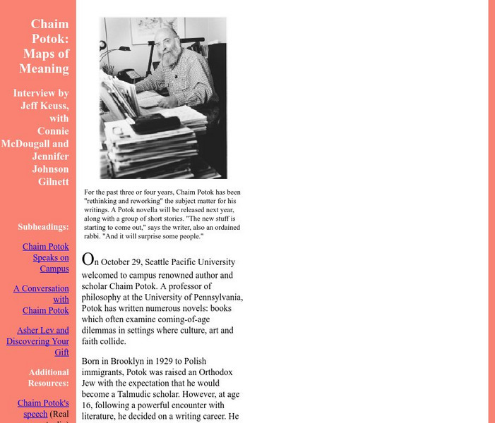 Read about a speech, given by Chaim Potok, at Seattle Pacific University, in which Potok discusses his novels and their cultural and religious messages. "A Conversation with Chaim Potok," includes Potok's responses to several questions...