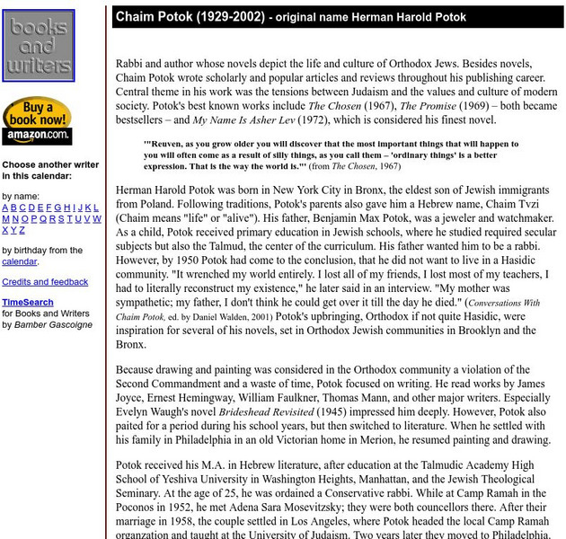 Chaim Potok's first novel, The Chosen, of two Jewish boys coming of age is examined in depth in this interesting site. Find out more about the characters, their motivations and the themes in the novel.