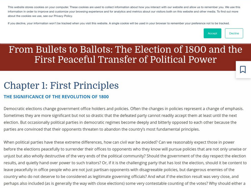 The first chapter of the ebook, From Bullets to Ballots: The Election of 1800 and the First Peaceful Transfer of Political Power, explores the emergence of democracy and the election of 1800. How did the United States evolve into a more...