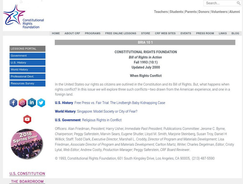 What happens when rights conflict? Explore sample conflicts: Free press vs. fair trial, religious rights in conflict, and Singapore: model society or city of fear? Great learning activities and lesson plans for teachers and students.