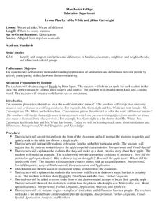 Students investigate similarites and differences. In this multi-cultural lesson, students discuss how people are alike and how they are different by comparing apples to people.