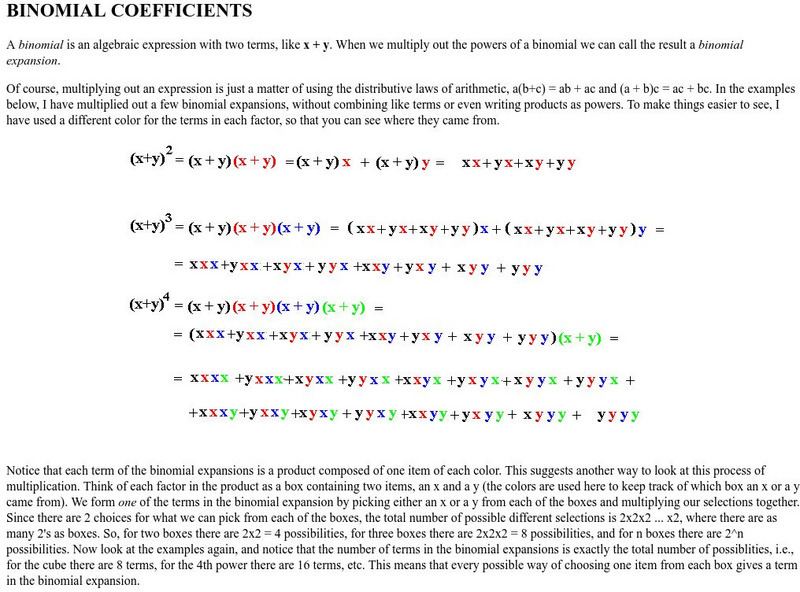 This site from the University of Saskatchewan provides an explanation of factoring by grouping, greatest common factor, perfect squares, and difference of squares. Higher degree polynomials factored as well. Some examples provided along...