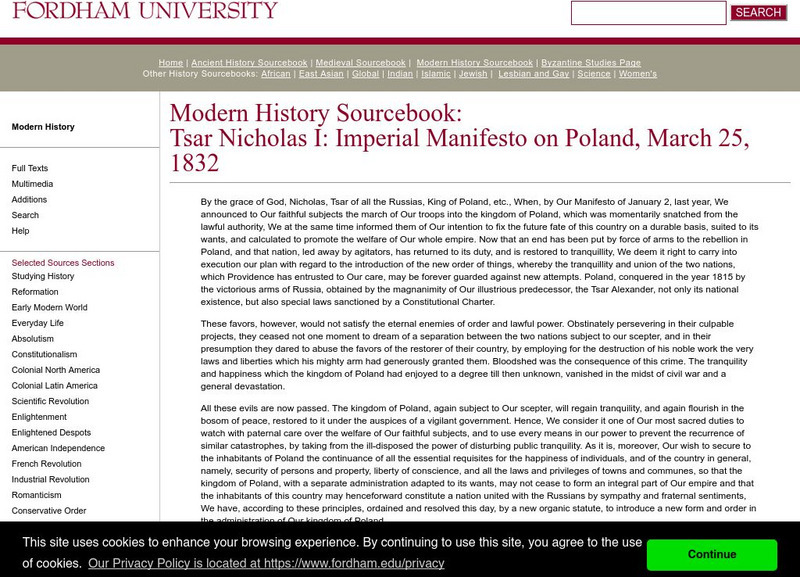 In responding to events which briefly allowed the Russian monarchy to lose its foothold in Poland, the Tsar calls for the maintenance of the Polish monarchy. Site by Fordham University.
