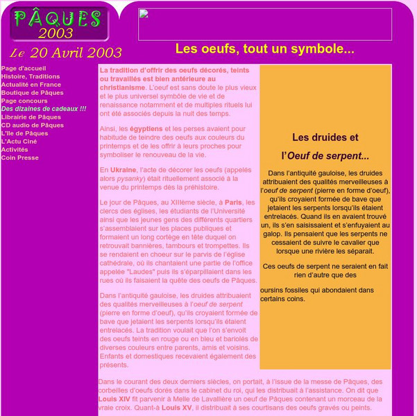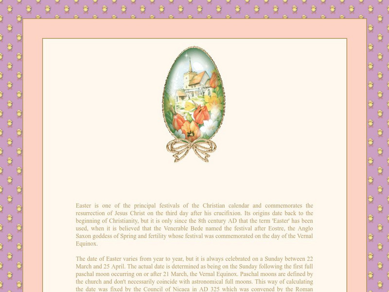 A historical account of the symbol of the Easter egg is presented at this site. Details range from easter egg hunts to candy eggs.