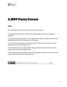 Pia is putting stickers into party bags. She starts by putting 10 stickers in each bag, and over the course of a week she adds several bundles of ten stickers to each bag, as well as making more bags. Second graders must find the number...