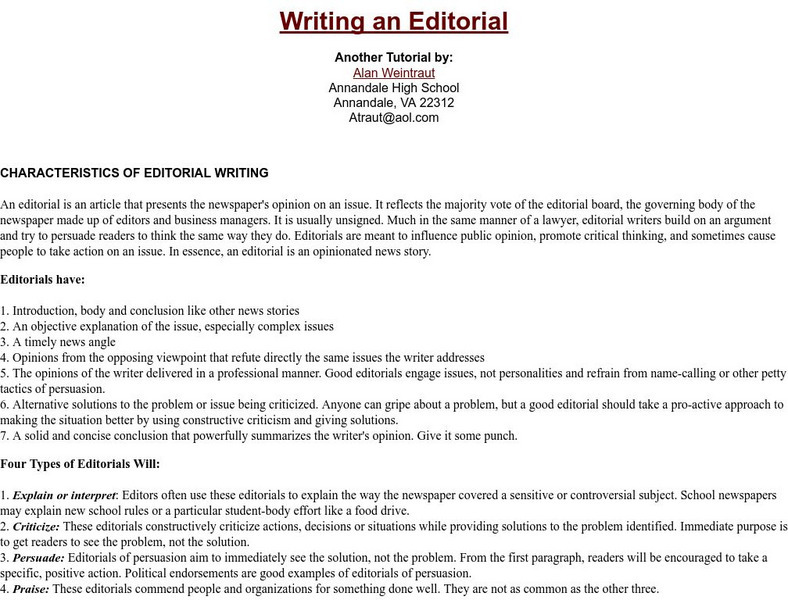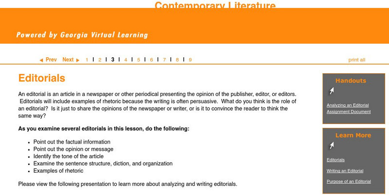 This lesson focuses on editorials including understanding their purpose and analyzing them. It provides links to analyzing an editorial handout, "Writing an Editorial" tutorial, and "PBS NewHour: Student Voice" essays.