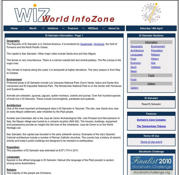 Great resource that is full of background information about the Central American country of El Salvador. Content includes geography, environment, architecture, religion, food, history, economy, arts, sports, and news. Be sure to look at...