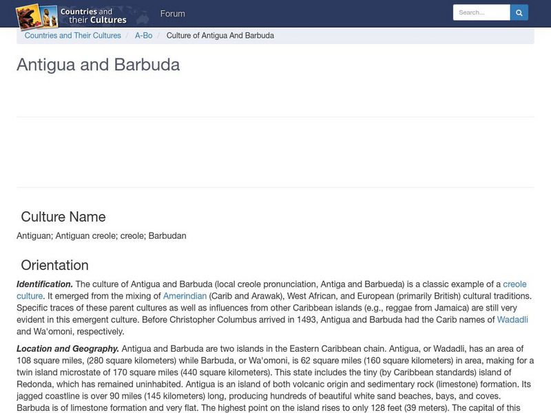 Provides an overview of the culture of Antigua and Barbuda. Gives basic information on topics such as geography, ethnic makeup, languages, symbolism, economy, food, customs, social stratification, family life, education, religion,...