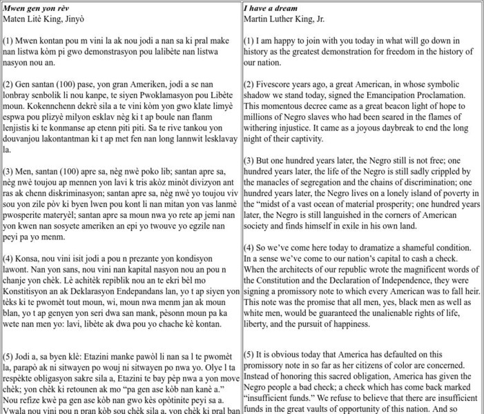 Martin Luther King, Jr.'s famous "I Have a Dream" in both English and Haitian Creole.