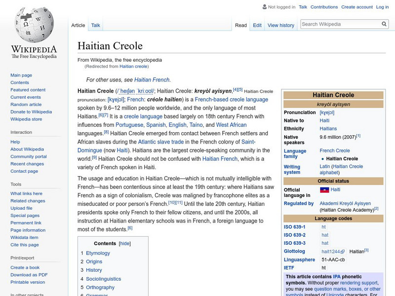 A Wikipedia encyclopedia entry on the Haitian Creole language. Includes information about the African and European origins of the language and sample words and phrases. Additional links to a passable online dictionary, Radio France...