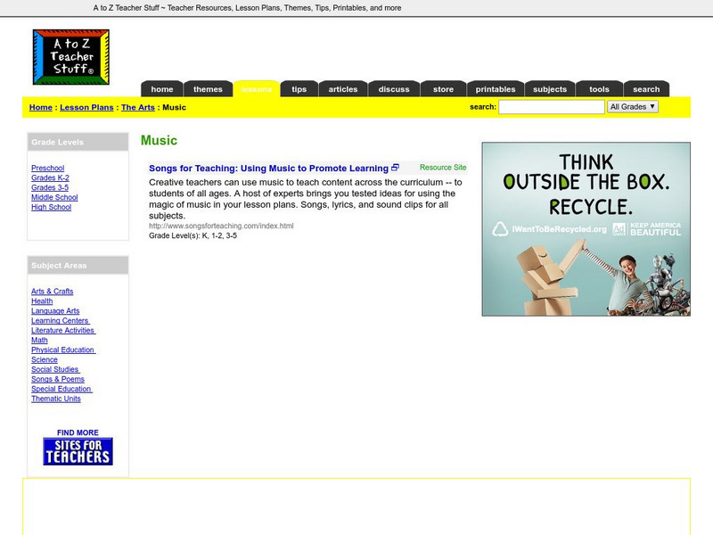 LessonPlanZ.com, a searchable online database of lesson plans, and provides a listing of music-related lesson plans.