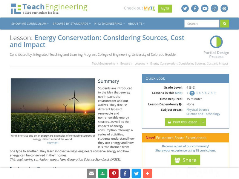Students are introduced to the idea that energy use impacts the environment and our wallets. They discuss different types of renewable and nonrenewable energy sources, as well as the impacts of energy consumption. Through a series of...