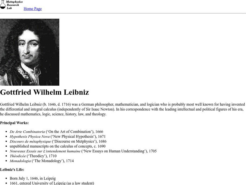 This site outlines Gottfried Wilhelm Leibniz's life. Categories include principal works, Leibniz's life, Leibniz's contributions to philosophy, and further readings.