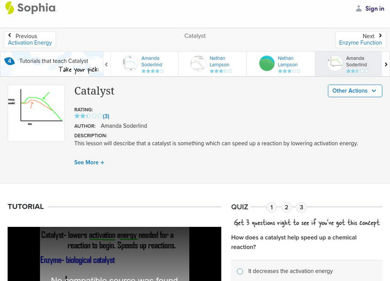 This lesson will describe that a catalyst is something which can speed up a reaction by lowering activation energy. It is 3 of 4 in the series titled "Catalyst."