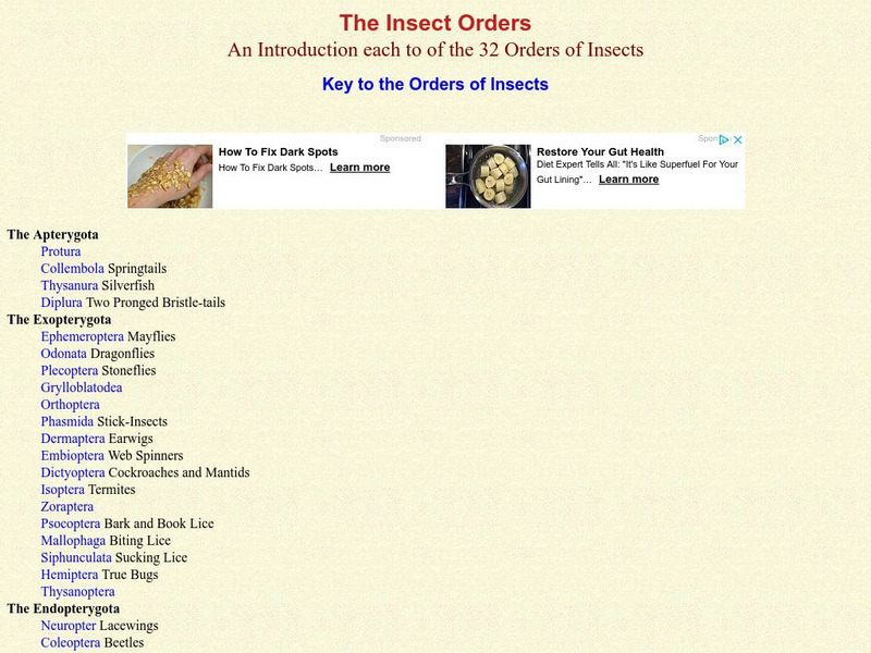 A very thorough look at the world of insects. This site examines the 32 orders of insects and gives a complete explanation of the characteristics of each order. Text is supplemented with pictures.