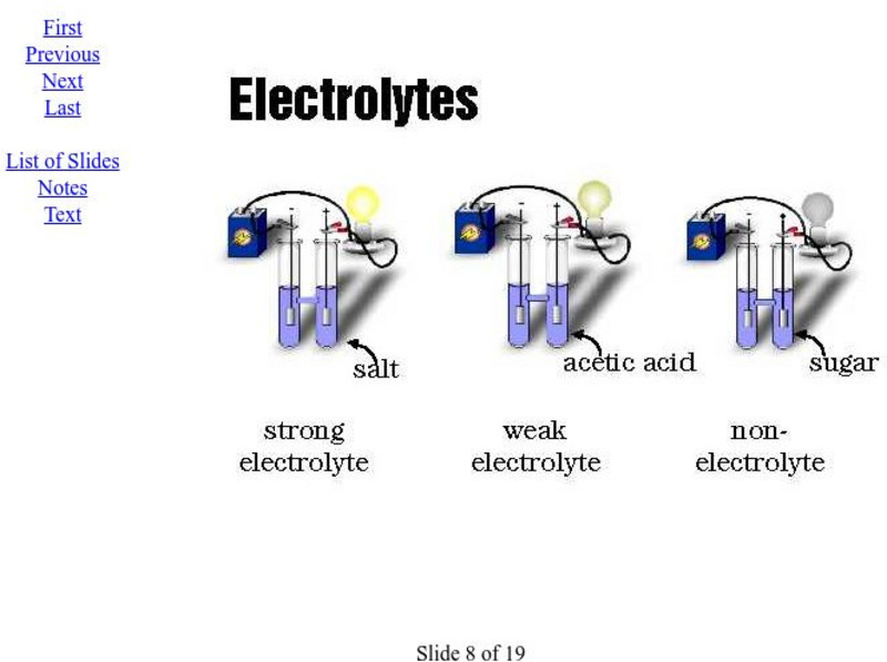 This page has animated 3-D graphics that illustrate the dissociation of strong and weak electrolytes.